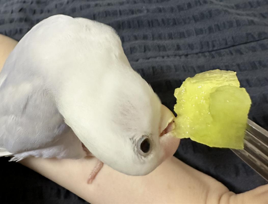 最初は怖がっていましたが少しくちばしについたのが甘かったのか小さな欠片を食べました。
