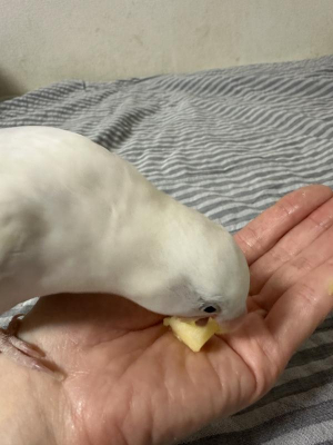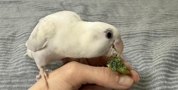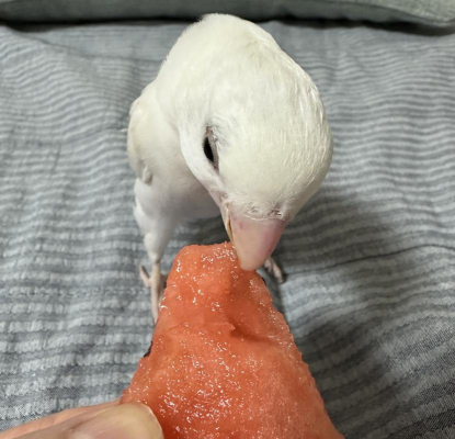 実家のオカメはくちばしを緑にしながらさやえんどうを一生懸命むしゃむしゃ食べていました。