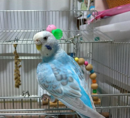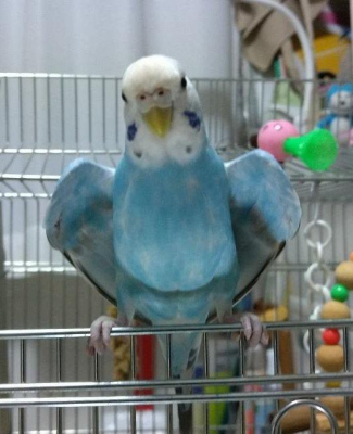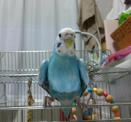 特徴:体長約12㎝。色は空色です。両ほおに青いマーク。くちばしは黄色。爪は家に来てから切っていません。人慣れしていますが手乗りとまではいかず、体に止まるのみです。人の言葉はしゃべりません。