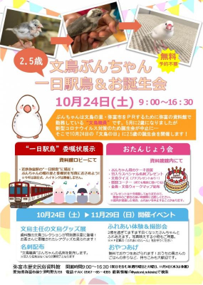 10月24日の「文鳥の日」に、ぶんちゃんの一日弥富"駅鳥"就任イベント&2.5歳の誕生日イベントを開催します。