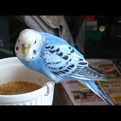 色:頭は白、体は青、羽は黒斑点模様、メス