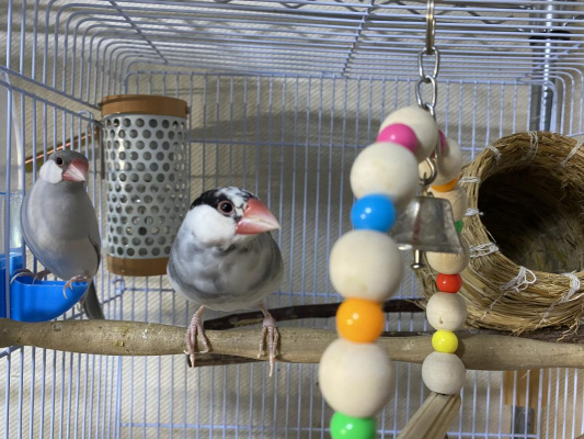 我が家には文鳥が二羽おり、仲がいいため一緒に飼っています。シルバー文鳥と桜文鳥で雌雄はわからなかったのですが、どちらかが卵を産んだため急遽壷巣をケージ内に設置しました。