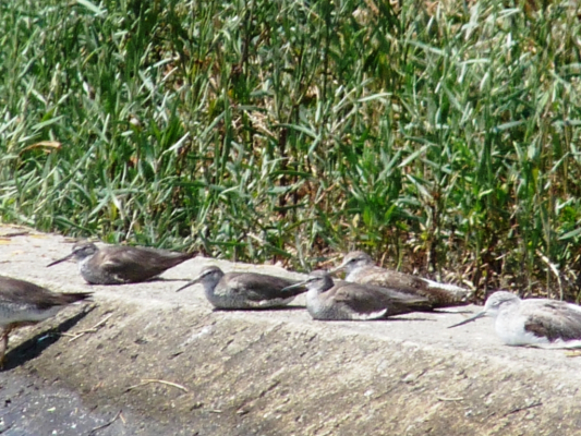 シギ、チドリ達も暑いのか、足を片足にして見たり、うずくまってみたり、葦影に入ればいいものをコンクリートの上でじっとしてるんですよ