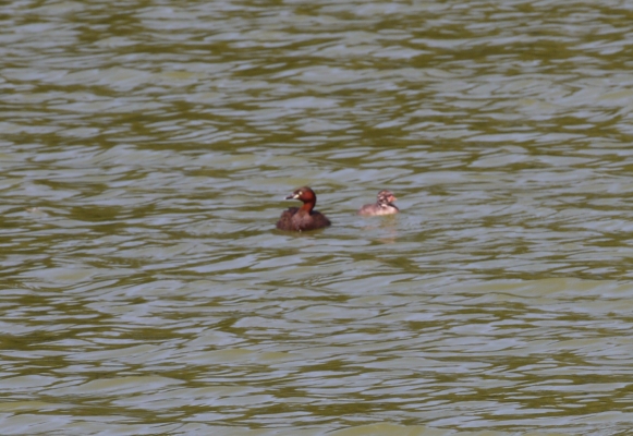 メジロのお出迎えに、いつもの水鳥達。カイツブリの親子。