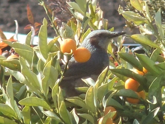 スズメと、ヒヨドリ、鳩しかまだ来てくれません、目白ちゃん早く来ないとみかんなくなるよと言ってるのに・・