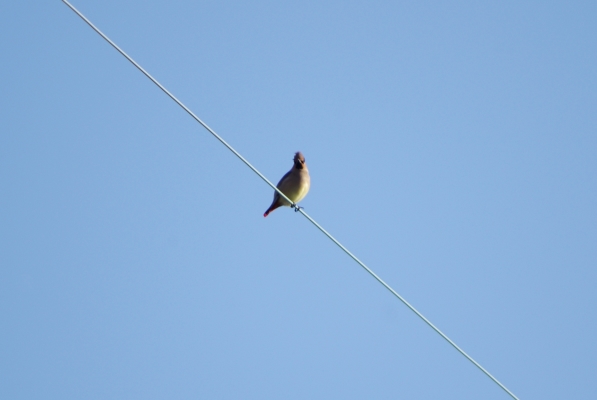 幸先良いなあと、ハイになって見てたら電線の上のヒレンジャクも