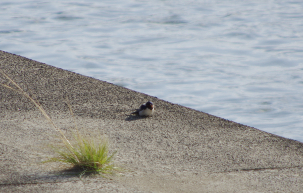 ふと気付くと、ツバメが川の岸壁にしゃがみ込んでます。