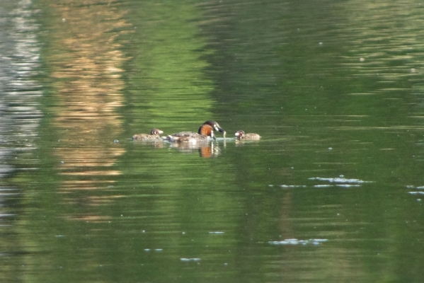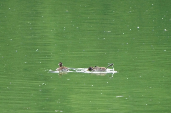 カイツブリも4羽の雛は3羽と1羽に分かれ親鳥と木陰で雨宿り。