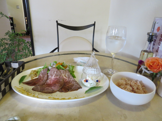 なーんとランチの後で足湯が使えるんです、日替わりで、その日はバラとミルクの湯でした
