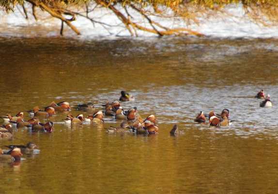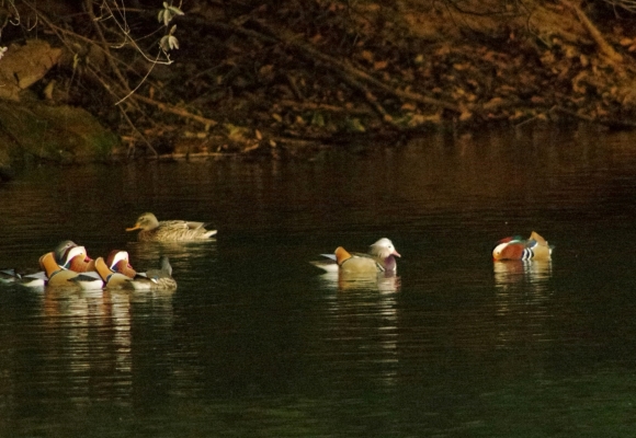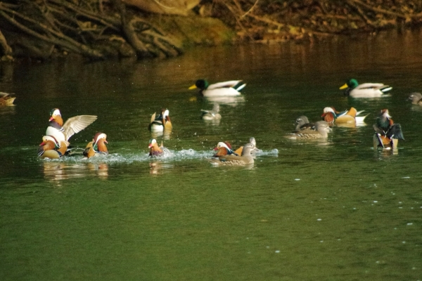 数が増えたオシドリ達の中に、おや、頭が白いのが。