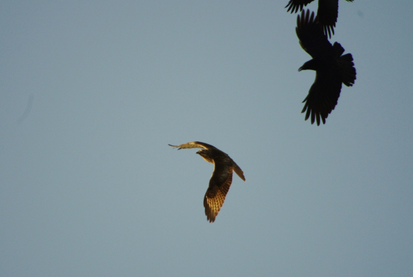 去ろうとするノスリを執拗に追いかけてアタックするカラス達。