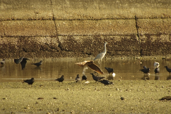 トビやカモメも歩けば当たります。川の河口では、引き潮のときに餌を求めて