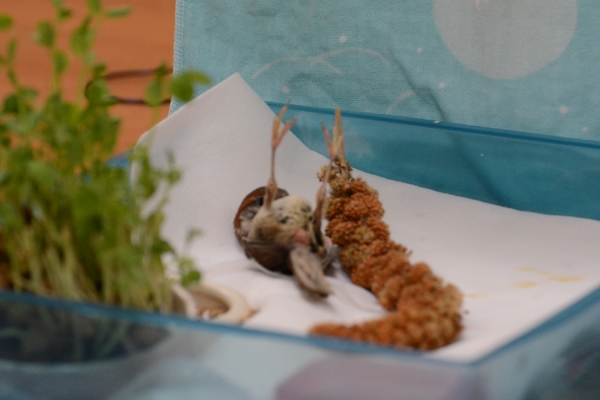 やはり、食べました、ホッ。雑食性なのでミルワームや小松菜も食べています。