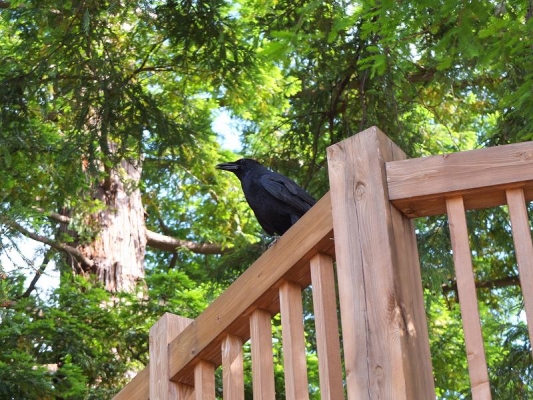 動画のカラスの雛は巣立ち直後に撮影したかのデッキの手すりに