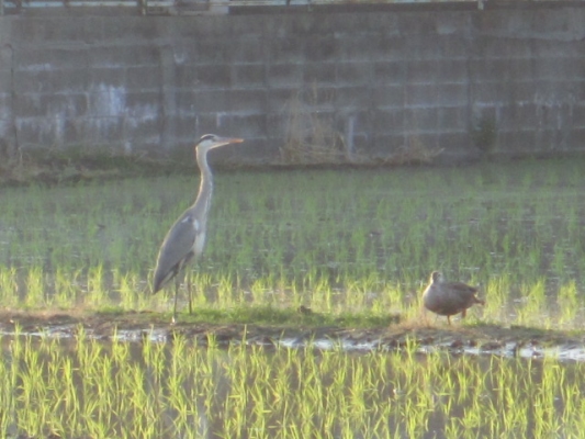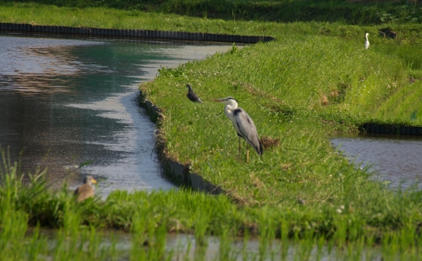 静けさが戻ると、さっそくカルガモ5〜6羽、アオサギが1羽飛来。