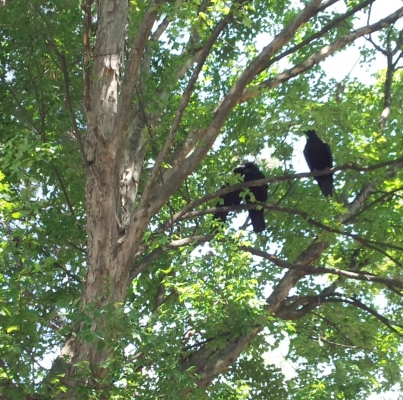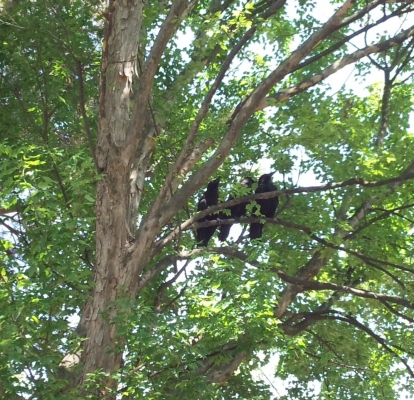 巣立ちしたカラスが、「ジョアジョア」と(そう聞こえるんです)あちこちで鳴いてますね。
