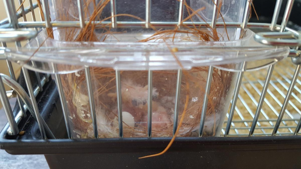 ペアのキンカチョウを飼って1ヶ月ちょっと。壷巣を入れずにいましたが、ご飯ケースを巣にして卵を産み、3羽の雛が孵りました(汗)