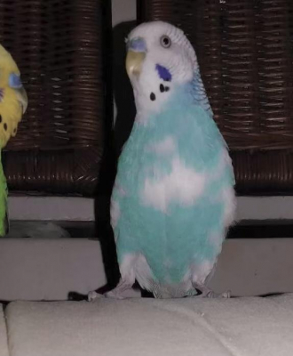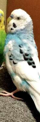 色: 白と水色 ほっぺと羽に黒い模様があります