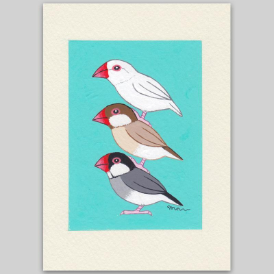 イラストレーター・ヨコイマウの「文鳥ブレーメン」の手描きの一点モノ原画を販売しています。かわいい文鳥のタワーです。白文鳥、シナモン文鳥、ノーマル文鳥が積み重なっています。背景はターコイズブルーです。