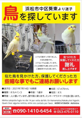 【迷子】静岡県浜松市オカメインコ迷子