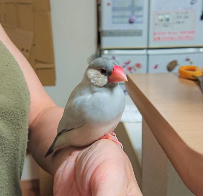 シルバー文鳥/頭はグレー、頬と嘴の下は白、おなかは白~グレーのグラデーション