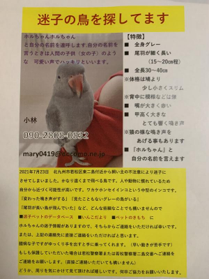 その他情報:ホルちゃんと自分の名前を言えます。自宅近辺は毎日探していますが目撃情報もなく声さえ聞こえない状況です。クリッピングをして時間が経っているのでかなり遠くまで飛ぶことができると思います。