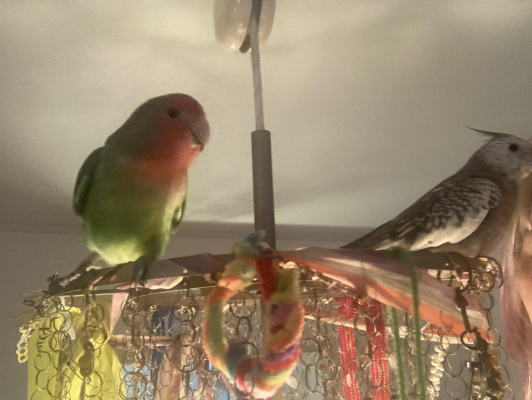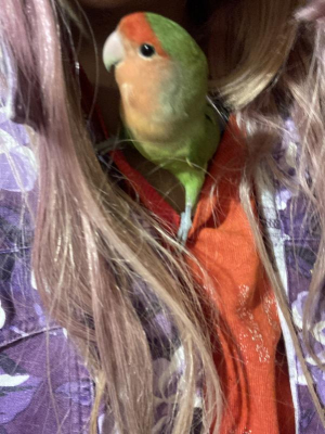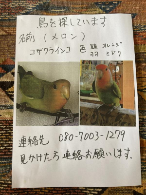 特徴:11ヵ月のおとこのこです。名前を呼ぶと返事をします。人が好きで、肩や頭にとまったりします。