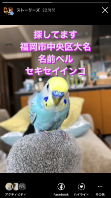 日時:2022年4月11日10時頃 場所:福岡市中央区大名 鳥の種類:セキセイインコ 名前:ペルちゃん 色:頭が黄色、羽根が緑っぽい青色 特徴:元気で活発な男の子 届先:福岡県中央警察署警固交番 投稿区分(本人or代理):本人 その他情報:Twitter @kcyc