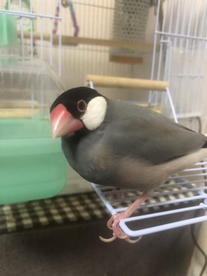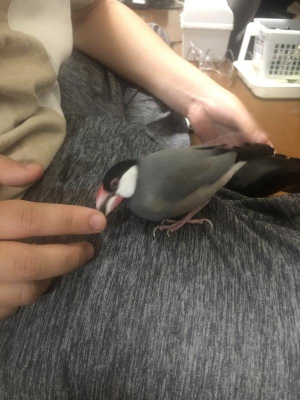 特徴:人が大好きで肩、手の指、足、頭、などに乗る。オスなのでキレイな声でよく囀る、特に足の指が好きで、ぴょんぴょん飛び跳ねながら囀る。部屋の中でも常に人にくっついている。自ら人の所に行くが、触られたり、握られるのは苦手。後ろから捕まえられるのは恐怖。知らない所に対してとても臆病。カーテンを開けると窓を怖がっていた。