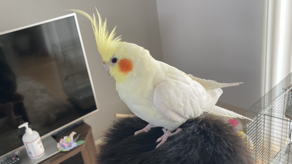 色:白色の羽毛、顔から上は黄色、頬がオレンジ色