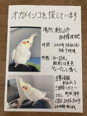 その他情報:玄関から飛び立ちました。かなり高く羽ばたいていき、やがて鳴き声も聞こえなくなってしまいました。周辺に声がけをしてチラシを貼っていただいています