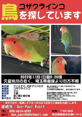 日時:11月1日 場所:埼玉県新座市 鳥の種類:コザクラインコ 名前:プリンセス 色:赤、緑、黄色 特徴: 届先: 投稿区分(本人or代理):代理 その他情報:
