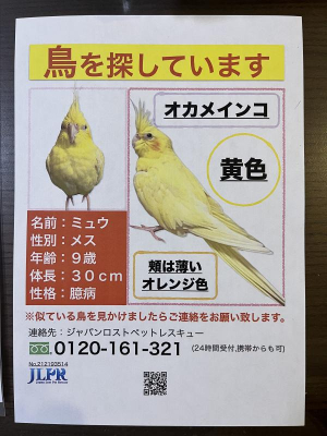 その他情報:保護した、見かけた等の情報がありましたら、ジャパンペットレスキュー 0120-161-321 又は小金井警察署までご連絡下さると嬉しいです。