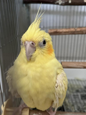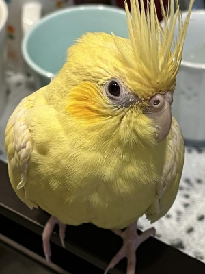 特徴:ルチノーですが、全体的に黄色いです。ほっぺのオレンジ色は薄め。9歳のメスです。家族にはベタ慣れでしたが、初めての人には慎重です。肩に乗るのが大好きです。