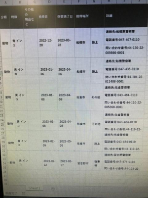 警察の遺失物として届出されているということですが、毛色が珍しいので保護されても警察から連絡が来ない場合があるので、遺失物検索してKonpiさんから各警察署に確認を取られたほうが良いかな。と思いました。ご自身で検索されるのが1番だと思いますが迷子の12月末から保護されたインコを抜粋したので、添付の資料も確認してみてください。