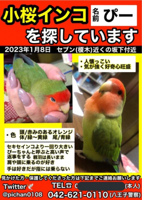 最近近所でコザクラインコを飼い始めた方など、外を緑の鳥が飛んでいたなど些細な情報でもいいので情報提供よろしくお願いします。