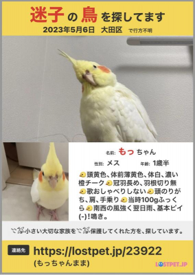 日時:2023.5.6 場所:東京都大田区 鳥の種類:オカメインコ 名前:もっちゃん 色:頭顔黄色、体前薄黄色、体白 特徴:冠羽長め、濃いオレンジチーク、羽根切りなし、歌お話しない、当時100gふっくら 届先:蒲田警察、幸警察