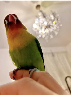 色:ルリコシ 顔 赤茶 首元 橙・黄色 全体緑でクチバシが赤