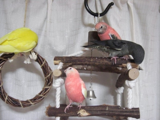 1羽ずつ放鳥すると・・・もう1羽の籠から離れないのと私の時間の都合で4羽同時放鳥です。(写真に載っていませんが4羽同時カーテンレールの上もありです。)