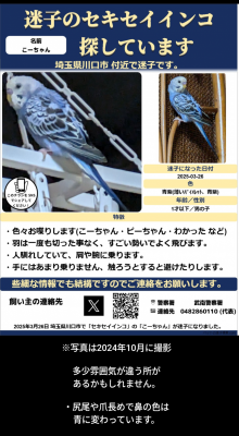 【迷子】埼玉県川口市 セキセイインコ探しています。