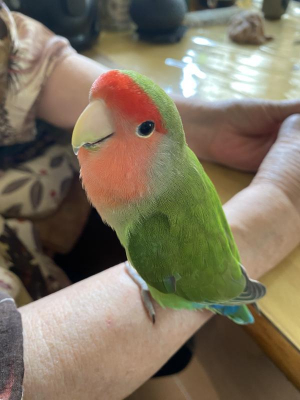 日時:2025/10/13 場所:茨城県守谷市 鳥の種類:コザクラインコ 名前:木の葉(このは) 色:頭部:赤 体:緑、青 特徴:目が大きい 届先:取手警察署 投稿区分(本人or代理):本人 その他情報:自宅の窓から外へ飛んでいってしまいました。