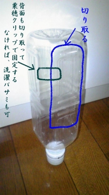 粟穂のカスが散らからない用に、ペットボトルを利用した容器を作ってました。