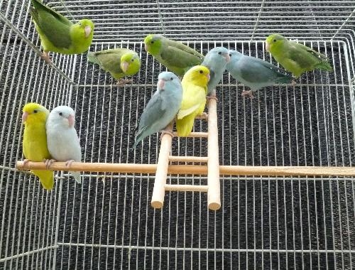 きょう、残りの3羽の雛を親から離しました。10羽追い込みに入れておきましたが、AYの雄がブルーの雌に追いかけられ始めたので、兄弟6羽別の籠に移しました。