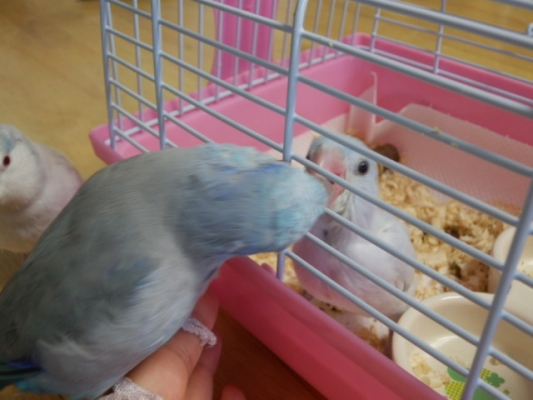 >あっちゅんもヒナに興味津々ですね。ここは一つ手乗りマメを増やしても・・・。きっとあっちゅんが挿餌してくれますよ(^^)