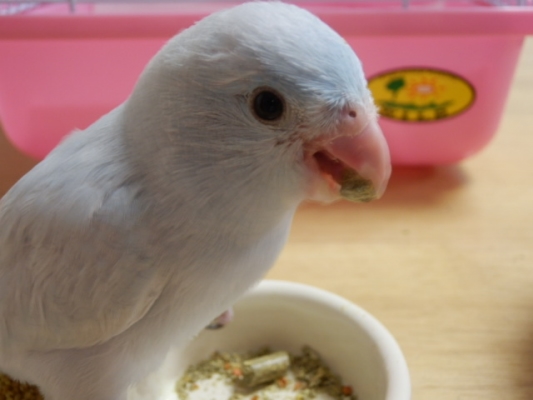 うちのすーちゃんはメス確定でよさそうです。指のかじり方もメスっぽいです(笑)もう挿餌は食べてくれません。やっぱり鳥からもらう方がおいしいんでしょうか。ぼつぼつ一人で食べ始めましたが、8割がたくぅちゃんまかせで楽しています。