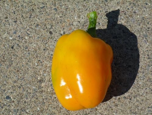 >昨日は普通のピーマンでしたが、きょうは赤く色付いたバナナピーマンを入れました。破片も結構散らかっていますが、お腹にも入っていると思います。