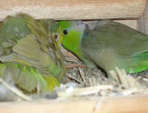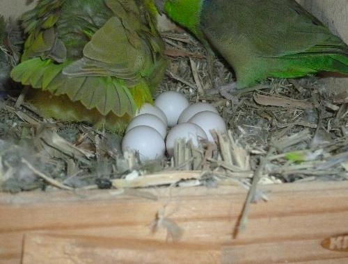 >気が強いグリーンファローの雌、巣箱の中を確認したところ中に7個の卵がありました。