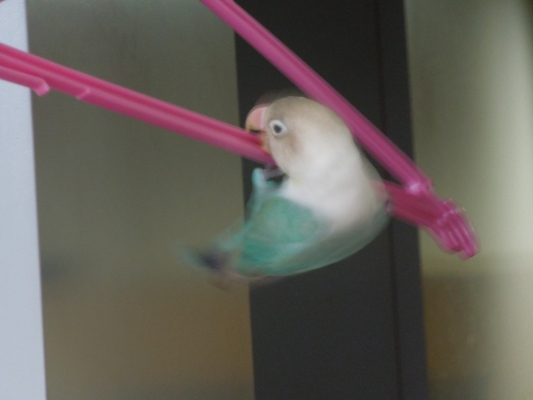 グリーンのコザクラは手乗りなのでまめと遊んでいると気にしています。