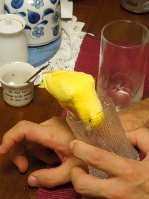 両手に鳥ですね、コザクラとボタンのように段々慣れてくるのですかね?コップ覗きたまには中に入って出られないなんてことは?