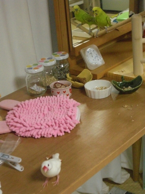 伸びてきたふくまるの爪切りをし、鳥たちのものを物色しに